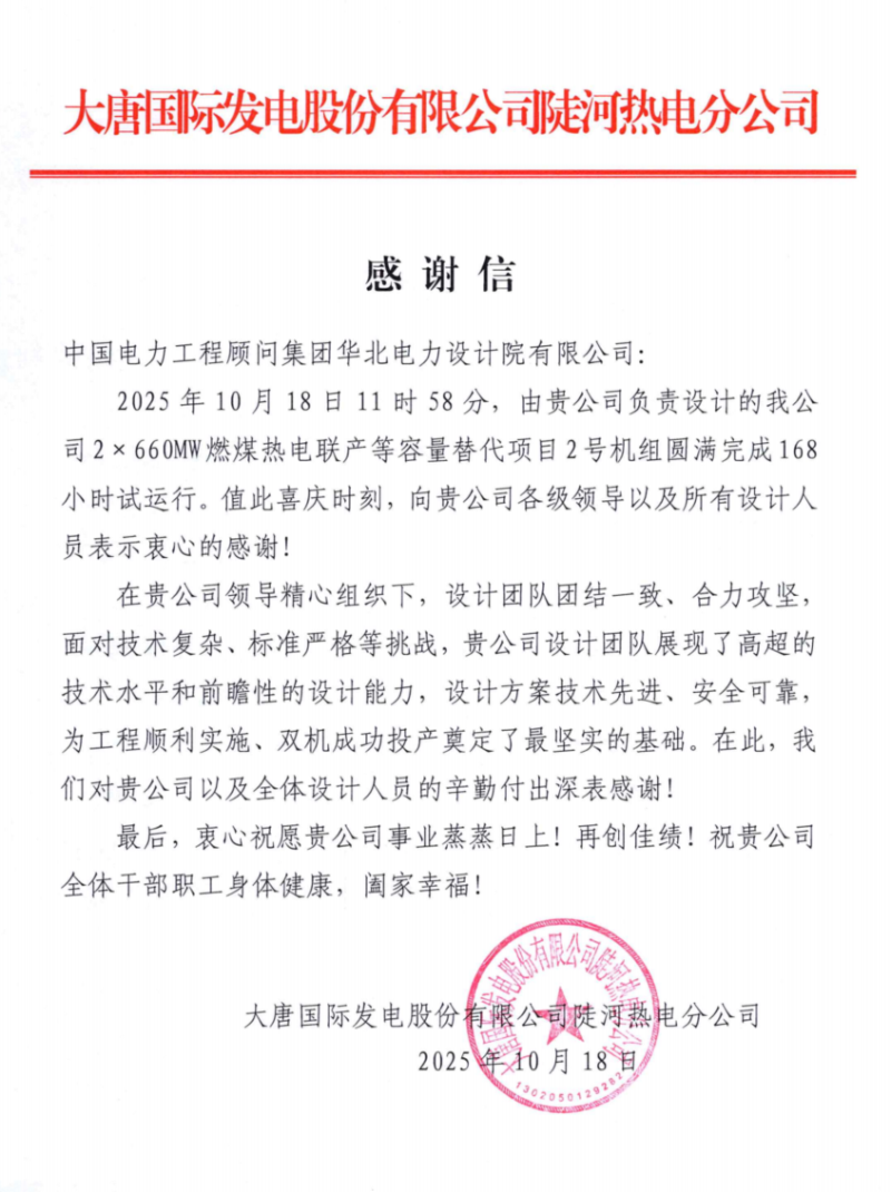 來自大唐國際發(fā)電股份有限公司陡河熱電分公司的感謝信