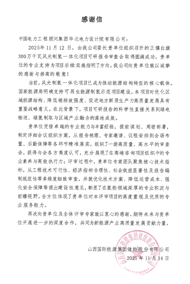 來(lái)自山西國(guó)際能源集團(tuán)儲(chǔ)能股份有限公司的感謝信